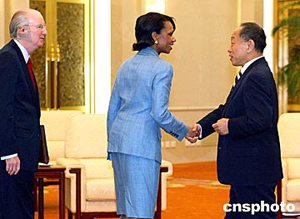 李肇星晤賴斯:美方應(yīng)認(rèn)清臺(tái)灣問題目前事態(tài)嚴(yán)重性 (2004-07-08)