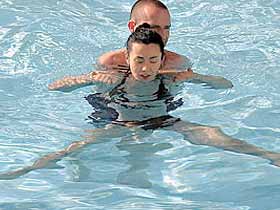 游了15分鐘,匿在太陽傘后的Brochard才在她的三催四請下,跳入水中與她來個鴛鴦戲水。只見身材健碩的他不斷抱起纖瘦的女友,而Maggie則不停哈哈地笑,笑容甜得像個初戀的少女。