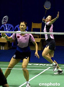 中國羽毛球隊(duì)女雙隊(duì)員黃穗(前)、上屆奧運(yùn)會混雙冠軍高崚,十五日在湖南益陽訓(xùn)練基地緊張訓(xùn)練,備戰(zhàn)雅典奧運(yùn)會。中新社記者:宋吉河