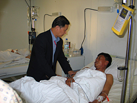 昆都士距喀布爾雖僅有三百多公里,但由于道路遭多年戰爭破壞,陸路要走八個小時。孫大使、徐武官和馬斗馳武官助理一行三人于上午10時登上聯合國僅有十幾個座位的小飛機,11時10分抵達。這起重大恐怖襲擊事件震驚了世界,也牽動了黨和國家領導人的心。孫大使臨赴工地前已得到胡錦濤主席、吳邦國委員長和溫家寶總理的指示,要求大使館全力搶救受傷同胞,妥善處理善后事宜。