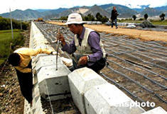 二○○四年七月下旬,筑路工人在西藏拉薩近郊青藏鐵路第三十一標(biāo)段鋪設(shè)路基、加固擋土墻,作鋪軌前的準(zhǔn)備。據(jù)專家理論預(yù)測(cè),青藏鐵路開(kāi)通后,到西藏旅游的人數(shù)將逐年增加一百萬(wàn)人次以上。作者:王麗南