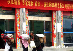 據最新統計數據顯示:截至二○○四年七月二十日,中國內地證券投資基金的凈值已經達到三千零一點九二億元,約占A股流通市值的四分之一。而在二○○三年九月,基金凈值占兩市A股流通總市值的比例只有百分之十三點五。圖為七月,云南香格里拉的幾位居民經過一家懸掛著基金銷售橫幅的銀行。中新社記者:武仲林
