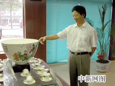 河北省委宣傳部副部長相金科參觀骨質瓷展示廳,對其中一只骨質瓷大碗頗感興趣。(秦欣攝)