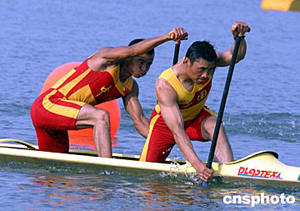 中國國家皮劃艇隊男子劃艇運動員孟關良(前)、楊文軍(后)七月二十六日在山東日照水庫訓練基地進行奧運賽前模擬實戰(zhàn)訓練,備戰(zhàn)雅典奧運會。中新社記者:張勤