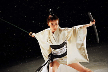 陳慧琳白色和服造型曝光 空中飛落亮美腿(圖) (2004-07-26)