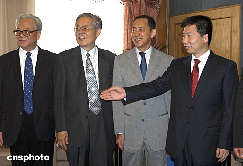 中國科學技術協會主席周光召(左二),七月三十日在北京中國科技會堂主持中國首飛航天員楊利偉(左四)與日本首飛航天員毛利衛(左三)會面。兩位航天員就太空飛行經驗等進行了友好交流并合影留念。