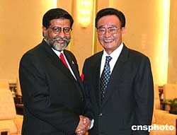 全國人大常委會委員長吳邦國二○○四年八月二日在北京會見來訪的巴基斯坦參議院主席蘇姆羅。中新社記者:滿會喬