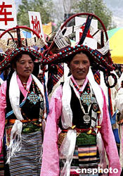 今夏西藏江孜地區(qū)農(nóng)民在盛大民間傳統(tǒng)活動中展示當?shù)夭刈宸棥V袊貐^(qū)地域廣泛,藏族服飾十分豐富,然變化最大的在于他們的頭飾。中新社記者:王麗南