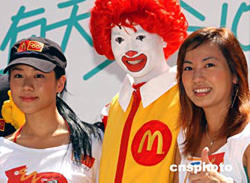 影星林嘉欣(左)4日出席香港麥當勞在銅羅灣時代廣場舉行早餐誓師大會﹐與主持人合影。