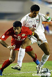 圖為伊朗隊14號隊員博哈尼(右)在與巴林隊隊員的爭搶中占得先機。中新社記者:盛佳鵬