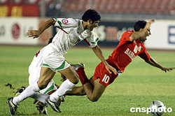 圖為在比賽中梅開二度的阿里·代伊(左)攔截巴林隊隊員的進攻。中新社記者:盛佳鵬