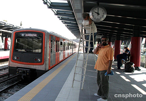 通往雅典奧運會主會場的輕軌鐵路雖然已經通車多日,但是多項收尾工程至今未完成。當地時間8月7日清晨,希臘工人依照傳統習俗不緊不慢地在站臺調試一直沒有運行的時鐘。中新社記者:任晨鳴