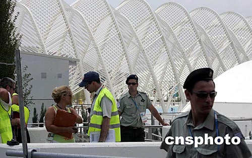 (當地時間)二○○四年八月八日,希臘保安人員在雅典奧林匹克體育場外執行警戒任務,確保奧運會場內外的安全。中新社記者:毛建軍
