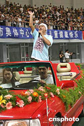由中國兒童少年基金會主辦的“關愛兒童遠離傷害”中國明星足球隊對戰公益企業聯隊義賽八日晚在河北省秦皇島市舉行,來自中國香港演員張衛健在比賽前的慈善晚會上獻歌助興。中新社記者:廖文靜