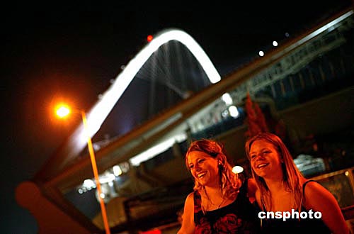 德國女生瑪瑞亞和克瑞斯汀那9日晚專程趕到雅典奧運會主體育場前拍照留念,盡管她們無法支付昂貴的入場券,但是雅典一游已經圓了她們的奧運夢。中新社記者:王瑤