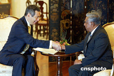 8月10日,新加坡總理吳作棟(左)在總統府正式向新加坡總統納丹遞交辭呈,從而為副總理李顯龍在近日正式接任總理一職鋪平了道路。