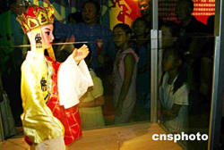 耗資二億元新臺幣建成的臺灣省臺北市偶戲館八月上旬開張。圖為一尊唐僧木偶,吸引不少觀眾駐足。作者:董會峰
