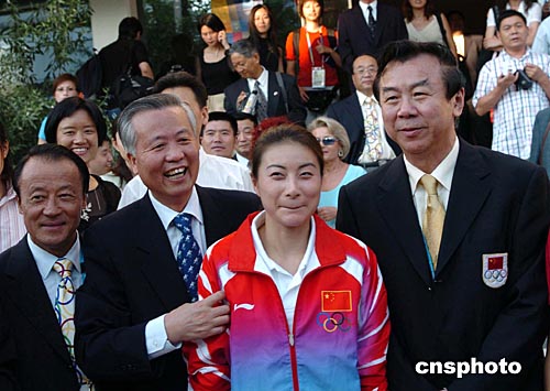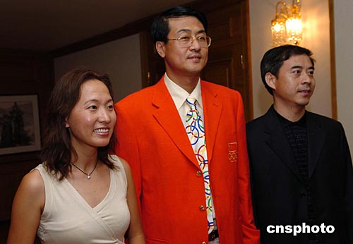昔日世界冠軍王軍霞現身雅典,在歡迎中國奧運代表團的酒會上,仍然是注目的人物。作者:陳佳