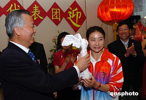 中國跳水隊靚女郭晶晶獲中國駐希臘大使唐振琪贈送“勝利女神”,寓意旗開得勝。作者:陳佳