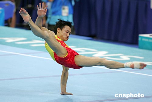 中國男子體操隊于當地時間八月十一日晚在雅典奧運體操比賽館與德國、日本、烏克蘭隊進行集體合練,圖為楊威在自由體操訓練中。中新社記者:毛建軍