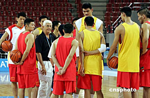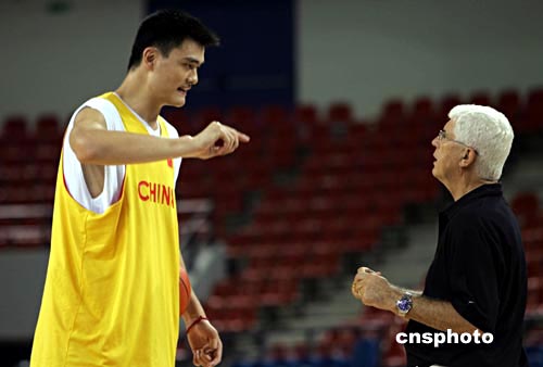 將要在開幕式上擔任中國代表團旗手的姚明在訓練中與主教練交流。