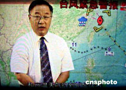 中國氣象局局長秦大河八月十二日在中央電視臺黃金時間的天氣預(yù)報節(jié)目上首次亮相,發(fā)布中國大部分地區(qū)即將出現(xiàn)臺風(fēng)和暴雨的緊急警報,同時顯示紅色的中國地質(zhì)災(zāi)害警報。中新社記者:賈國榮