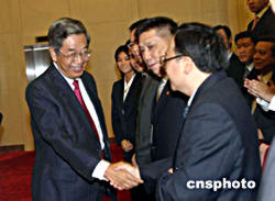 八月十二日,全國人大副委員長許嘉璐(左)在北京人民大會堂會見了“2004年海外華裔中青年企業家華夏行”的全體代表。中新社記者:史利