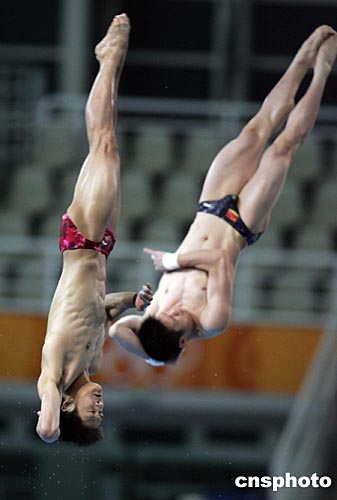 中國跳水隊隊員田亮、楊景輝當地時間八月十二日下午在雅典進行賽前訓練,他們將在十四日開始的奧運首日賽事中角逐男子十米跳臺雙人金牌。中新社記者:毛建軍