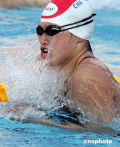 中國游泳名將羅雪娟當地時間八月十二日下午在雅典奧運賽場進行賽前訓練。中新社記者:毛建軍
