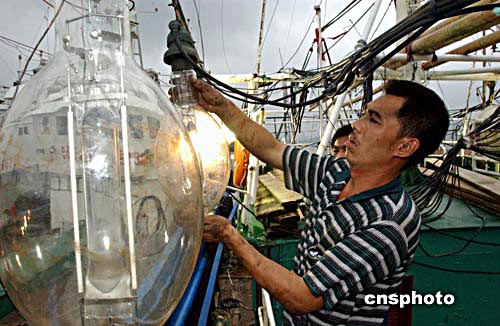圖為在象山縣石浦碼頭,漁民正抓緊時間修復被損的照明系統,準備開船赴外洋作業。