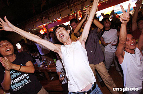 八月十四日晚,數千名游客聚集在深圳世界之窗愷撒宮狂歡,為奧運中國射擊選手杜麗和王義夫奪金喝彩。作者:陳文