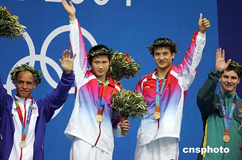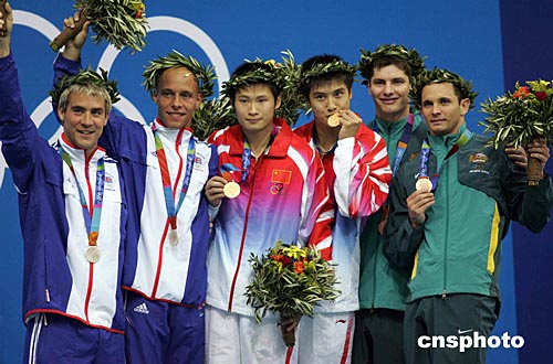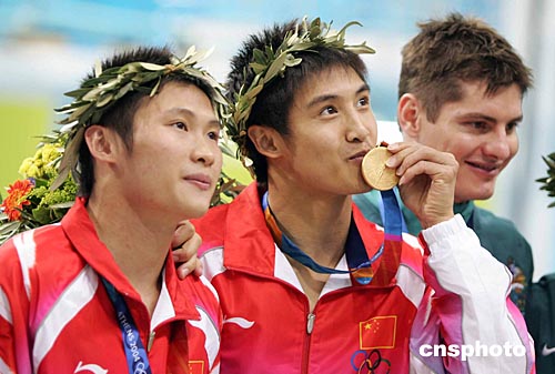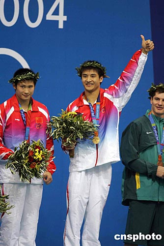 當(dāng)?shù)貢r(shí)間八月十四日晚,中國(guó)跳水隊(duì)田亮、楊景輝在雅典奧運(yùn)跳水館獲得男子雙人十米跳臺(tái)金牌。中新社記者:毛建軍