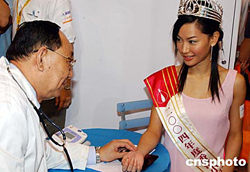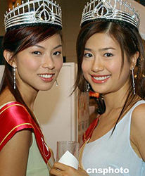 2004年度香港小姐冠軍徐子珊、亞軍朱慧敏、季軍符思思,八月十六日參加在香港會展中心舉行的美食博覽展,為一家制藥商造勢。中新社記者:錢興強