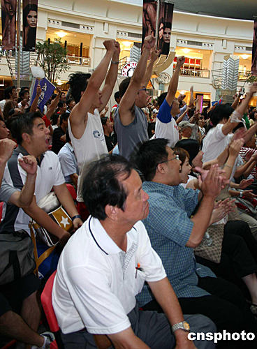 出征雅典奧運會的中國臺北棒球隊16日下午以3:0戰勝澳大利亞隊。圖為狂熱的棒球迷聚集臺北101大樓4樓,收看大屏幕直播。中新社記者:董會峰