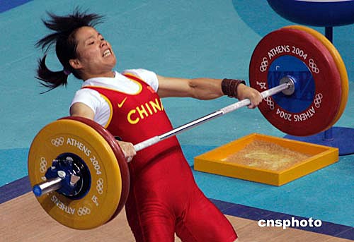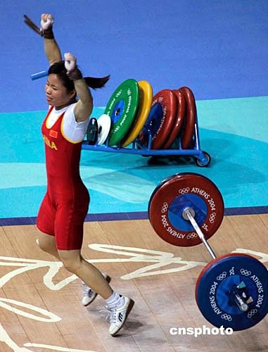 當(dāng)?shù)貢r(shí)間8月16日下午,中國女子舉重名將陳艷青在雅典奧運(yùn)女子58公斤級(jí)舉重比賽中獲得冠軍,為中國代表團(tuán)奪得第七枚金牌。作者:張煒