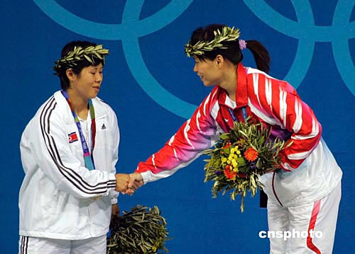圖為陳艷青與獲得銀牌的老對手、朝鮮名將李成姬握手。