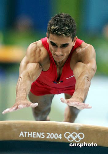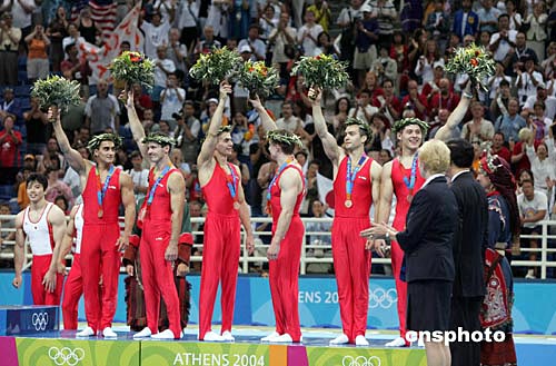 當(dāng)?shù)貢r間八月十六日晚,雅典奧運(yùn)男子體操團(tuán)體比賽在奧運(yùn)體操比賽館舉行,羅馬尼亞隊獲得銅牌。中新社記者:毛建軍