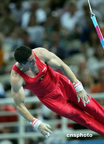 圖為羅馬尼亞隊員在吊環(huán)比賽中。