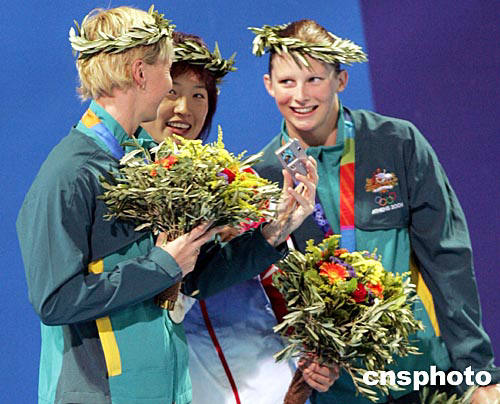 中國選手羅雪娟,雅典當?shù)貢r間八月十六日晚奇跡般奪得第二十八屆奧運會女子一百米蛙泳金牌。這是她在冠軍領(lǐng)獎臺上,頭戴橄欖桂冠,接受獲得第二、第三名的澳大利亞選手祝賀。中新社記者:任晨鳴