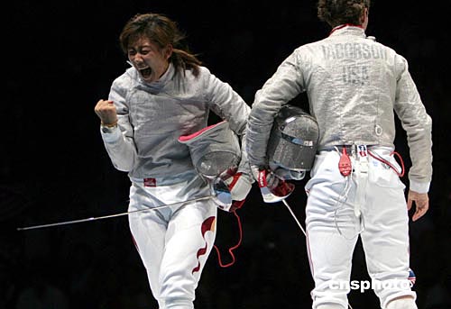 當地時間8月17日晚,中國女劍客譚雪在雅典奧運會女子佩劍半決賽中擊敗美國對手獲得決賽權。中新社記者:任晨鳴