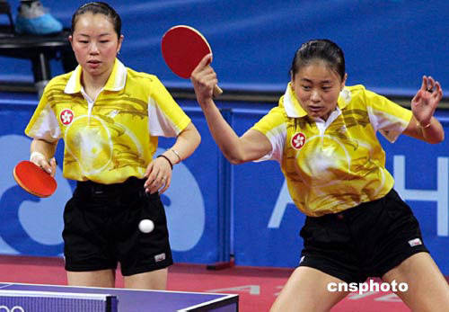 當地時間八月十八日,在雅典奧運會乒乓球女雙1/4決賽中,中國香港選手桑亞蟬、帖亞娜被王楠、張怡寧以2:4淘汰。中新社記者:張煒