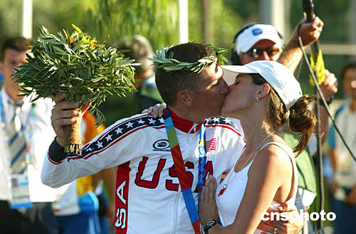 當地時間8月18日,美國自行車選手漢密爾頓在獲得奧運冠軍后,妻子獻上一吻以示獎勵。