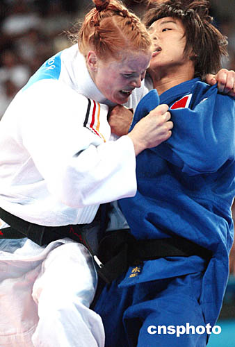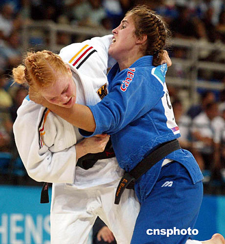 圖為在女子柔道-70公斤比賽中,加拿大選手ROBERGE Catherine和德國選手BOEHM Annett互相“搏斗”的畫面。