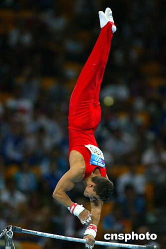 在當(dāng)?shù)貢r(shí)間8月18日舉行的男子體操個(gè)人全能決賽中,羅馬尼亞選手Marian Dragulescu上演空中倒立精彩一幕。
