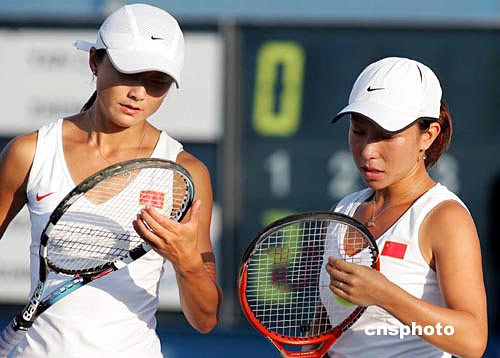 當地時間八月十九日晚,在雅典奧運網球女雙爭奪四強席位的比賽中,中國姑娘鄭潔、晏紫組合最終以兩個一比六不敵西班牙的帕斯奎爾、馬丁內茲組合,無緣四強。中新社記者:毛建軍