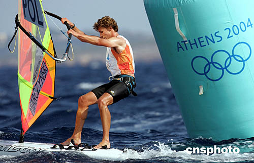 圖為波蘭選手Przemyslaw Miarczynski在當地時間8月18日舉行的男子帆船帆板比賽中的一個鏡頭。