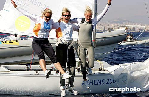 圖為英國隊在獲得今年才列入奧運會比賽項目的女子龍骨船-鷹鈴級比賽冠軍后,齊聲歡躍的情景。
