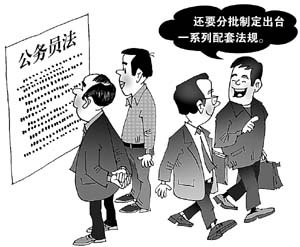 《公務(wù)員法》已進(jìn)入立法程序,2005年有望出臺。有關(guān)部門還將根據(jù)實(shí)際情況,分批制定出臺有關(guān)公務(wù)員范圍、職務(wù)職級、錄用、考核、工資、培訓(xùn)、申訴控告等一系列配套法規(guī),并研究修改公務(wù)員行政處分條例草案。