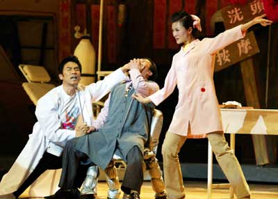 去年的《麻花1》中,主持人何炅的演技令人拍案叫絕。今年《麻花2》中的林依輪也不負眾望。一向以青春健康著稱的林依輪變身一個吊兒郎當的年輕醫生,身穿白大褂的他一上場便玩起了“亂打”。只見他揮舞著兩根一尺多長的“針灸專用針”,在一個飲水機的空塑料桶上盡情敲打,鏗鏘有力的鼓點贏得了觀眾們雷鳴般的掌聲。和林依輪配合的是手拿“心臟起搏器”和給骨折病人正骨的護士們,只聽“心臟”“怦怦”作響,“骨節”嘎嘎亂叫,和林依輪的“鼓點”配合得天衣無縫,一場“醫院亂打”就這樣神奇地開場了。