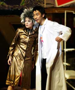 《麻花2》的舞美也是“后現代”風格的典范。演出一開場,3046年閃亮的舞臺和古怪的時空穿梭機便出現在觀眾面前,在耀眼的光芒中,2004年的“醫院”以寫實與抽象相結合的方式出現:矮小的窩棚一樣的病房上面,陳列著巨幅“現代派”油畫,客廳、黑貓這些形象交錯混雜在一起,乍看上去,《麻花2》的舞臺頗像北京七二七工廠附近的酒吧。演員拿的道具也頗有象征效果:近一米長的大針管、板磚一樣的心臟起搏器……《麻花2》將怪誕二字做到極致。